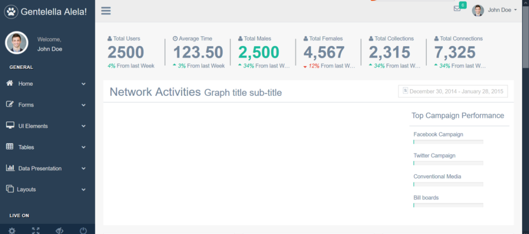 Gentelella 是一个可免费使用的 Bootstrap 管理界面模版,使用群体比较广泛,这个模版使用默认的 Bootstrap 3 的样式,还有一系列功能强大的 jQuery 插件和工具,可快速创建管理界面模版或者后台的 Dashboard。