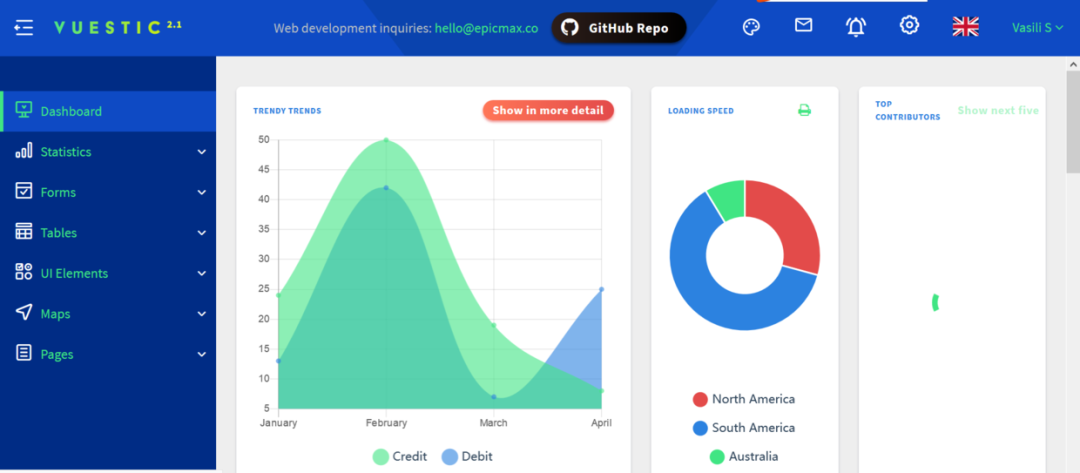 推荐指数:star:7.1k GitHub:https://github.com/epicmaxco/vuestic-admin 预览:https://vuestic.epicmax.co/admin/dashboard