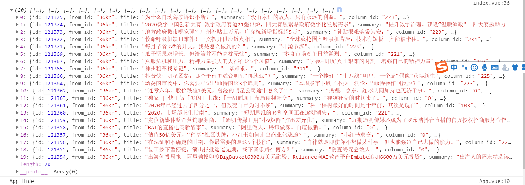 这个时候的步骤就不多说了,大家都非常的清楚,在data()里面定义一个空数组,将请求到的res.data赋值给空数组,然后进到view里面进行遍历,渲染数据到页面。