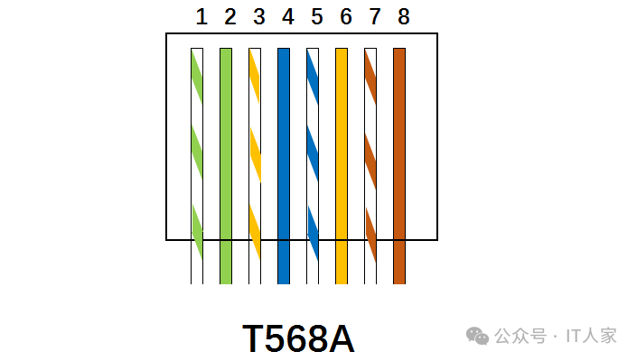 T568A线序:(白绿、绿、白橙、蓝、白蓝、橙、白棕、棕)