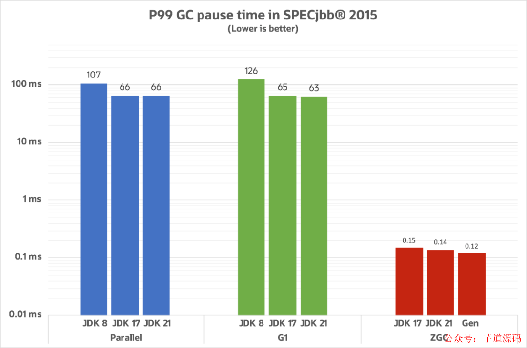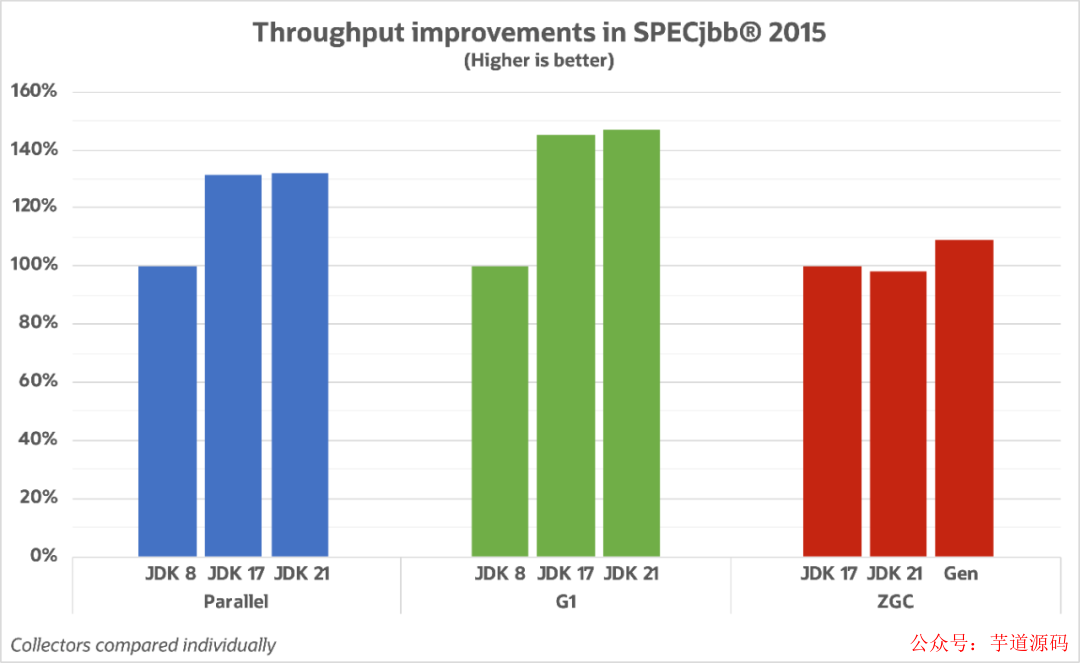 比较包括 JDK 8、JDK 17 和 JDK 21 的 G1 和 Parallel。对于 ZGC,我选择的三个数据点是 JDK 17、JDK 21 和 JDK 21 中的分代 ZGC。由于 JDK 17 是 ZGC 完全支持的第一个 LTS 版本,所以回顾更早的版本并没有太多意义。