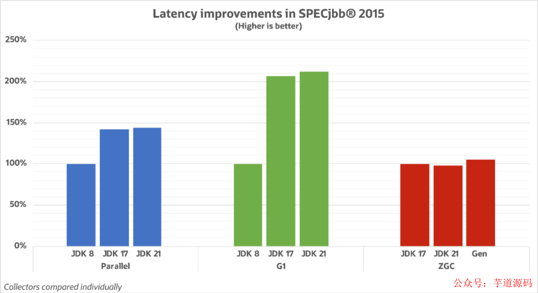 就原始吞吐量性能而言,与 JDK 17 相比,自 JDK 17 以来的改进并不是很大,但仍有轻微增加。但是,在下面的图表中,有两件事情真正值得关注。首先,JDK 8 和最新 JDK 之间的显著差异对于G1和Parallel来说。从性能的角度来看,离开 JDK 8 从来没有比现在更有益。