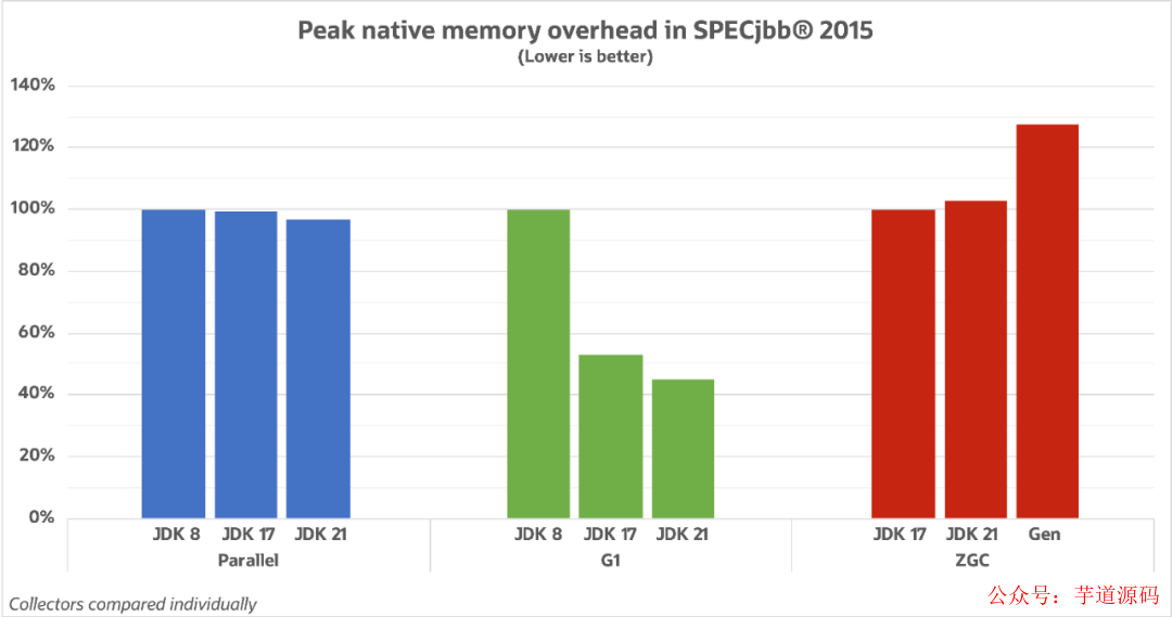 最后一个图表比较了在固定负载下运行基准测试时的峰值本机内存开销。就这个角度来看,Parallel 非常稳定,我们没有花费任何时间来进一步优化它。另一方面,对于 G1,我们在过去的十年中已经成功地消除了许多低效性,并且在 JDK 20 中,我们将 G1 改为只需要一个标记位图而不是两个。由此节省下来的资源是显著的,在这个基准测试中,G1 现在是最节省内存的收集器。