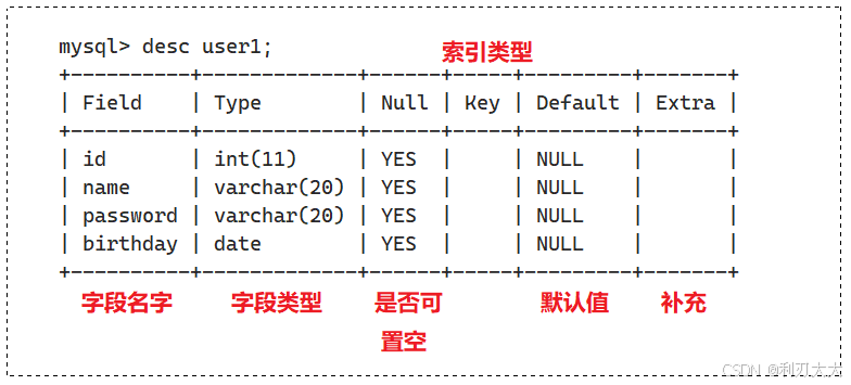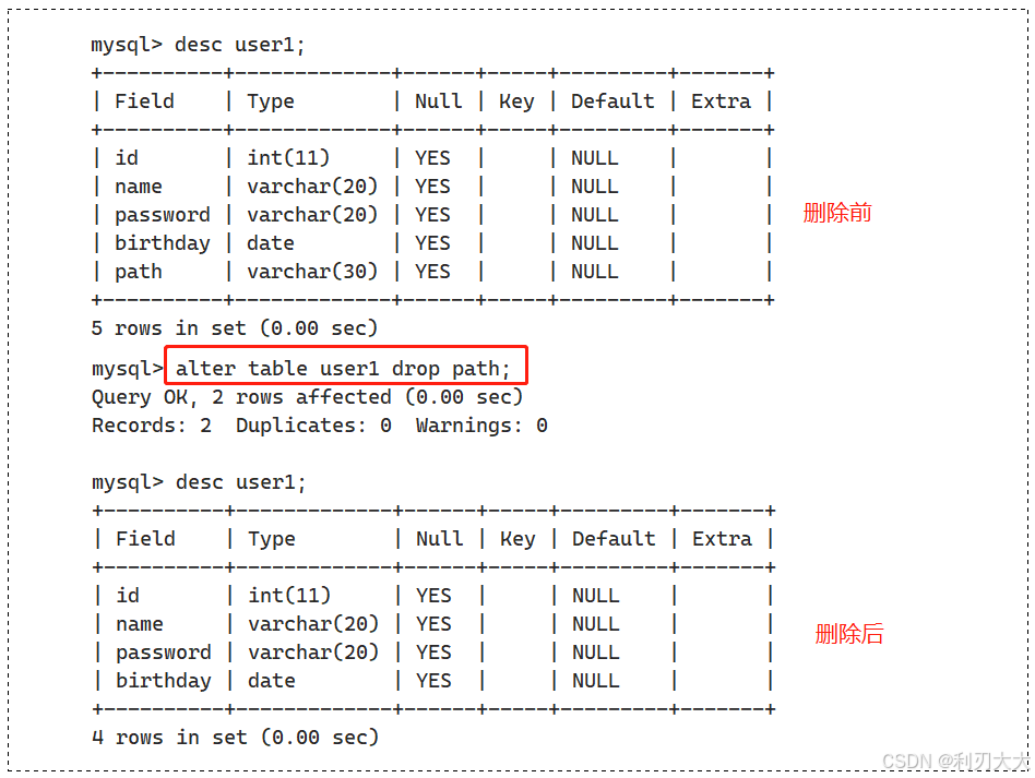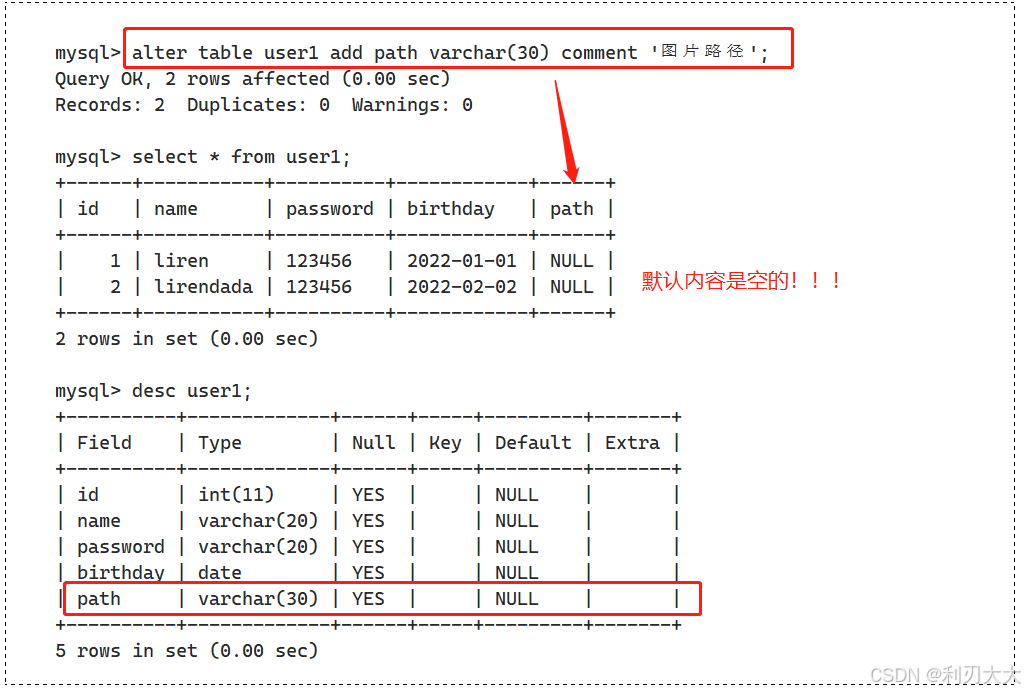 接着,我们此时要向 user1 表中新增一个字段也就是一个列,叫做 path,用来存放图片的路径(可能是 linux 目录下的某个文件路径,这个不重要),此时我们就要用上面的语句进行操作: