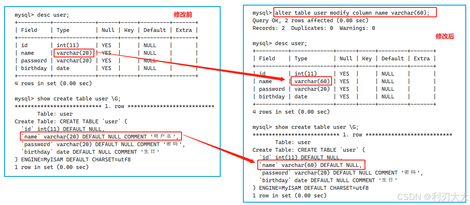 下面举个例子,将 user 表中的 name 字段大小从 20 改为改为 60,看看前后效果:
