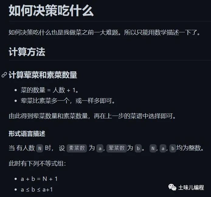 最让我困惑的地方在于,这个项目居然用数学公式去计算菜品的数量。我承认做多少菜也是个经验问题,使用数学公式去帮助定量似乎也没有什么问题。总觉得有些奇怪,但又说不上来……如果说前面的菜谱看不出来什么问题,那么这些数学公式可以说是将程序员的死板发挥到了极致。做饭的最大乐趣在于随机性,输入的东西是一样的,但输出的菜品“千人千面”。过度的定量会剥夺做饭的乐趣,难不成做饭之前还要先解个方程?产品经理与程序员之间的矛盾在于,程序员只会站在自己的角度设计产品,以为人人都是程序员。