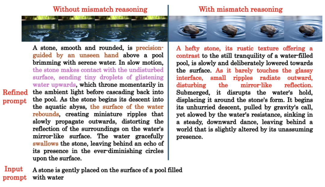 与现有提示增强方法相比,PhyT2V 的关键贡献在于分析当前生成的视频与提示之间的语义不匹配,并基于不匹配与相关的物理知识进行修正,而之前的许多方法只是简单地增强或修改提示。PhyT2V 的主要优势包括: