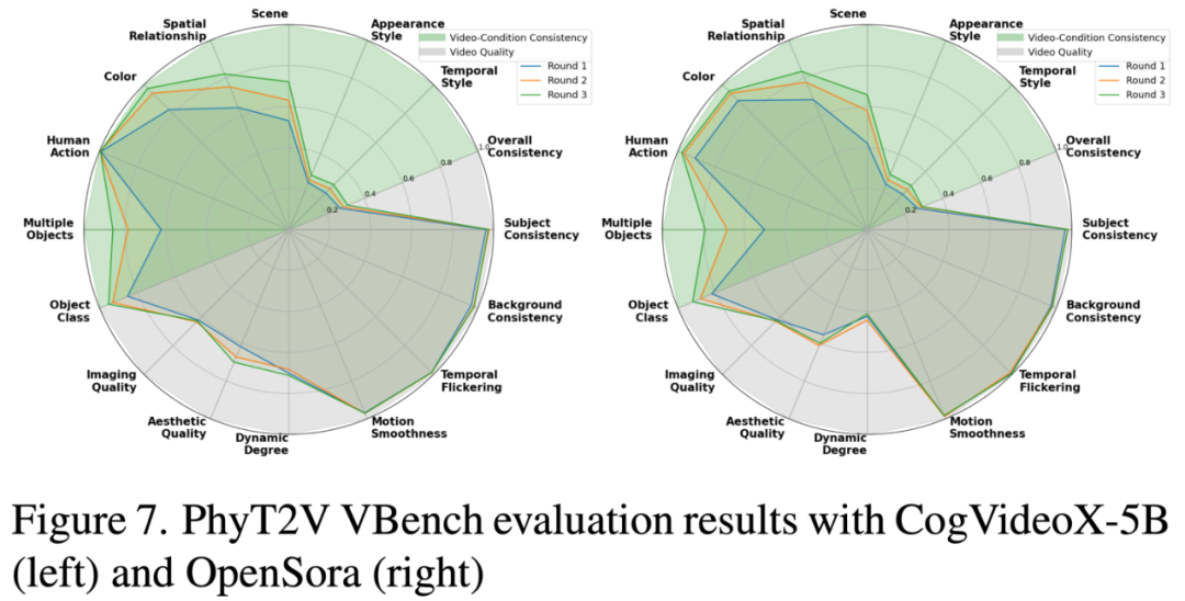 研究人员在多个基于 Diffusion Transformer 的开源 T2V 模型上应用了 PhyT2V,包括 CogVideoX 2B & 5B、OpenSora 和 VideoCrafter。