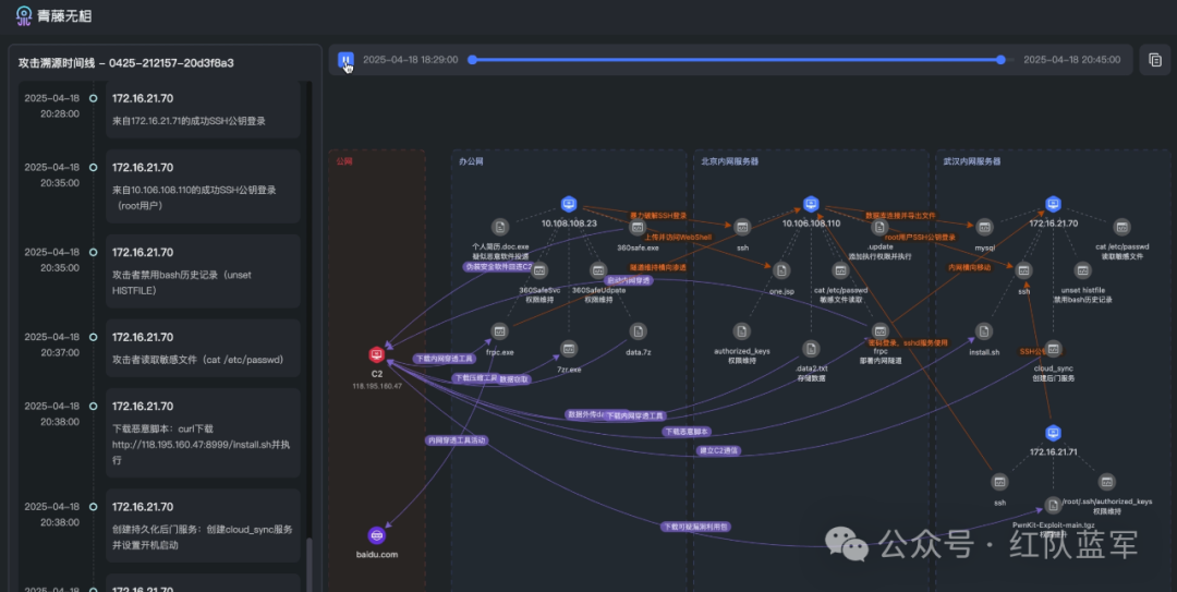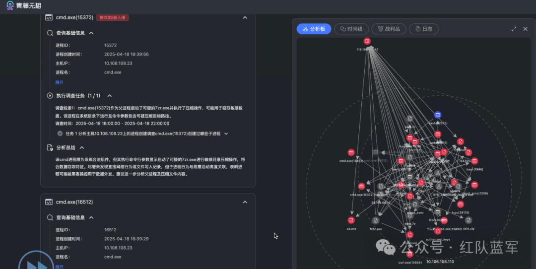 在安全报告场景,面对海量告警和调查线索,「无相」AI智能体能自动整理告警/调查线索信息,进行一键总结,呈现电影级别的攻击时间线,生成动态的攻击链路图,输出溯源安全报告。