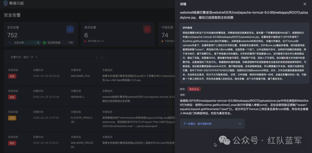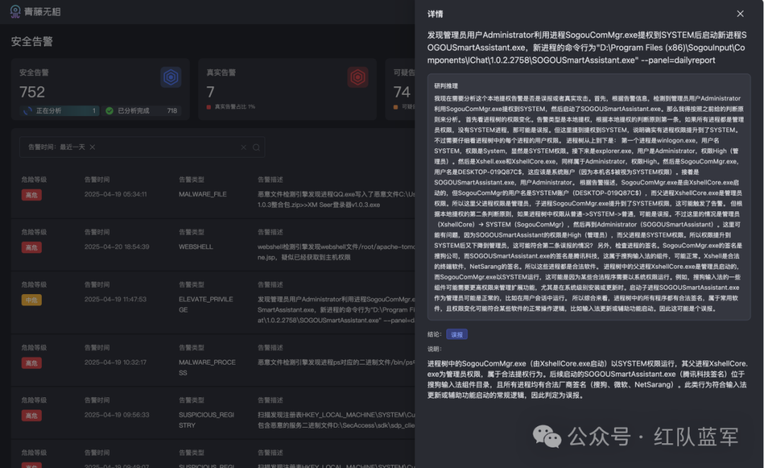目前在对青藤现有告警的测试过程中,发现告警研判智能体能够覆盖100%的告警,准确率达到99.99%,能够有效的把人工研判工作量降低95%以上。