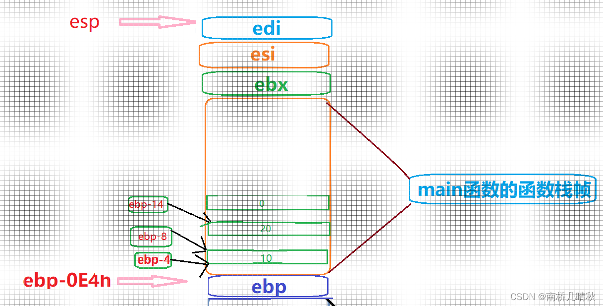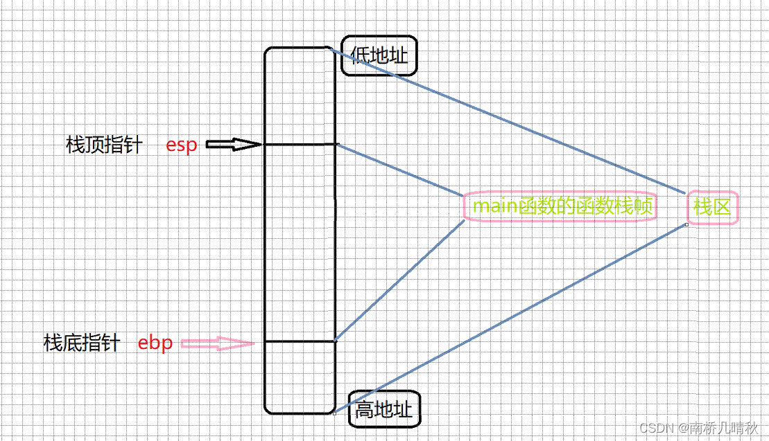 栈使用空间是由高地址到低地址 正在调用哪个函数,esp和ebp就维护哪个函数,在这里,我们调用的是main函数,那么就维护main函数。