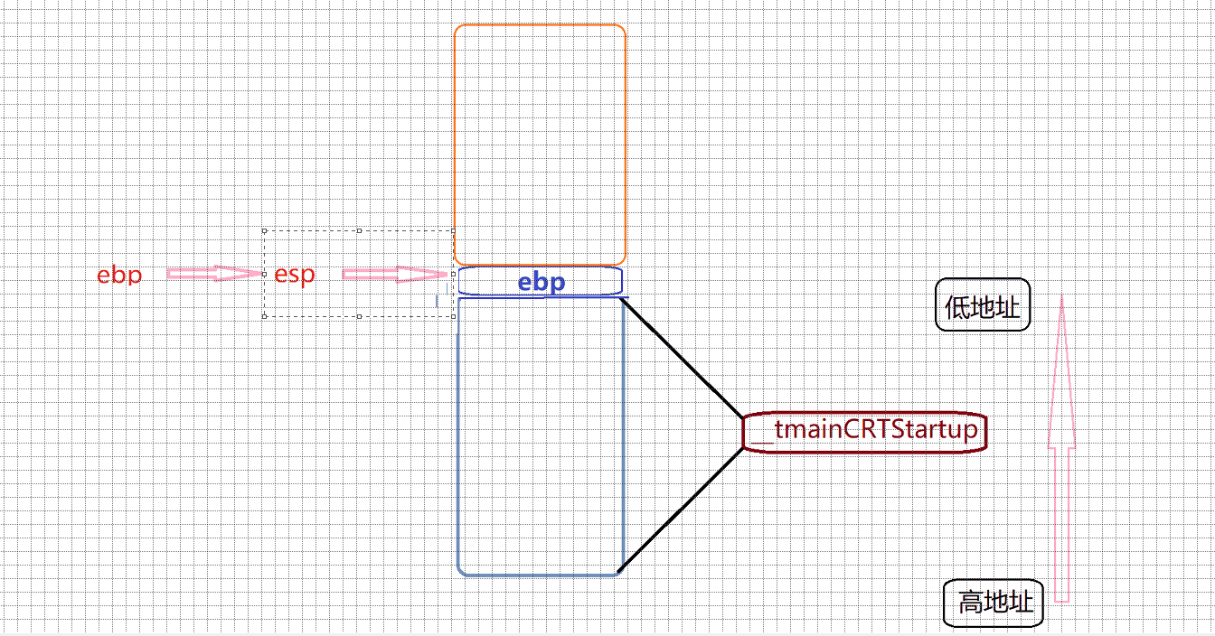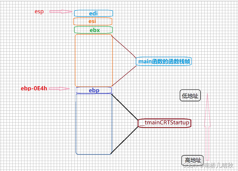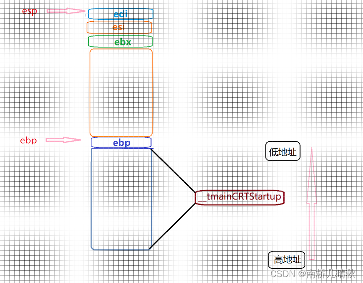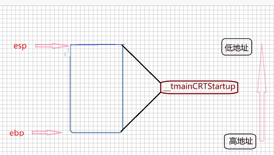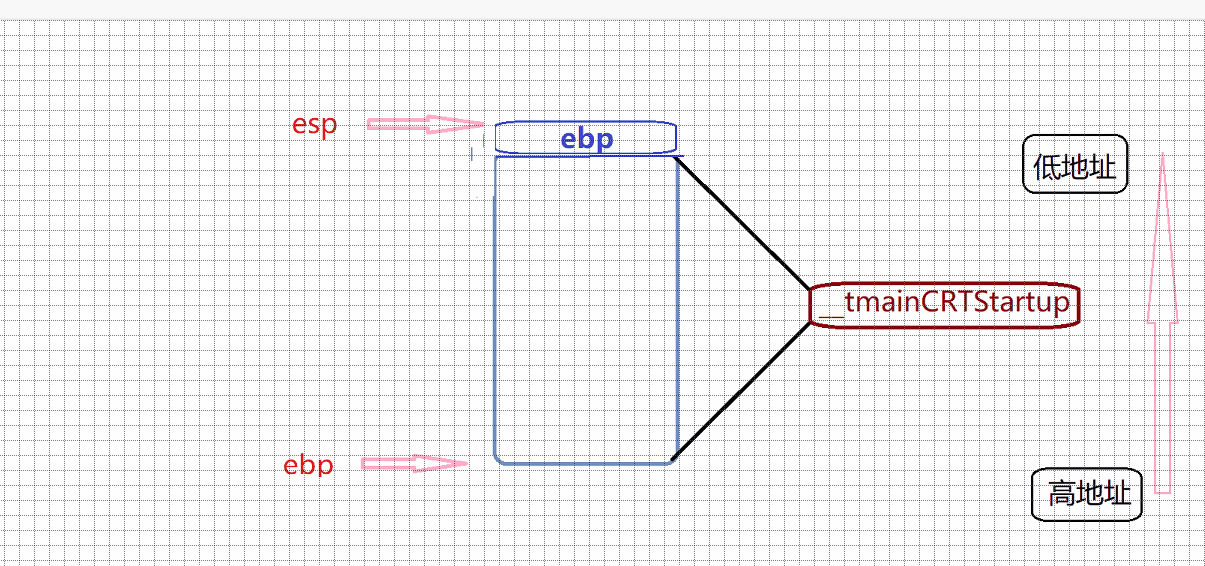 通过 __tmainCRTStartup 函数调用main函数,所以要创建好__tmainCRTStartup 的栈帧