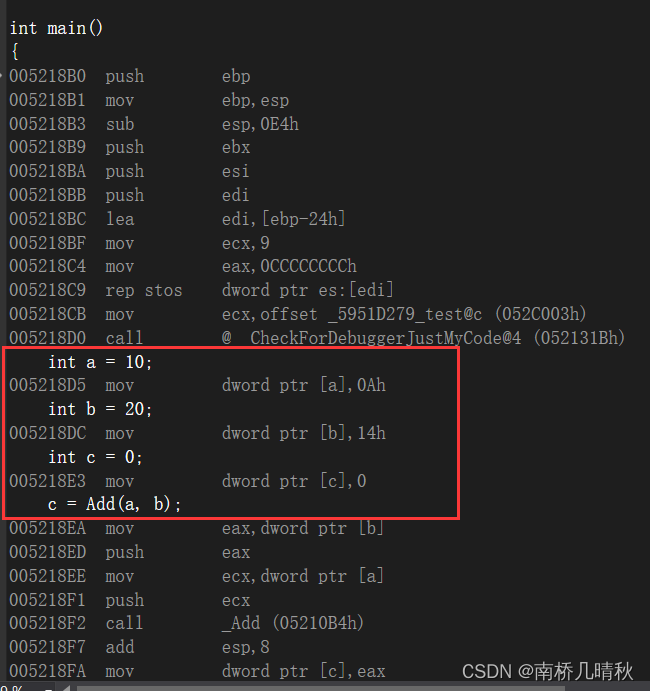 以下面一个详细的代码,描述函数栈帧的创建 本次代码是在 vs 2013 里面实现的,版本越低,可以更好展示