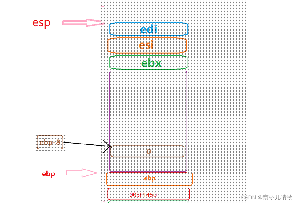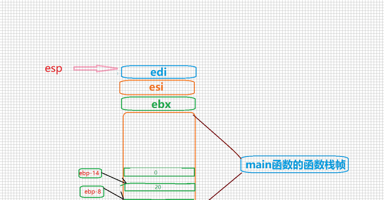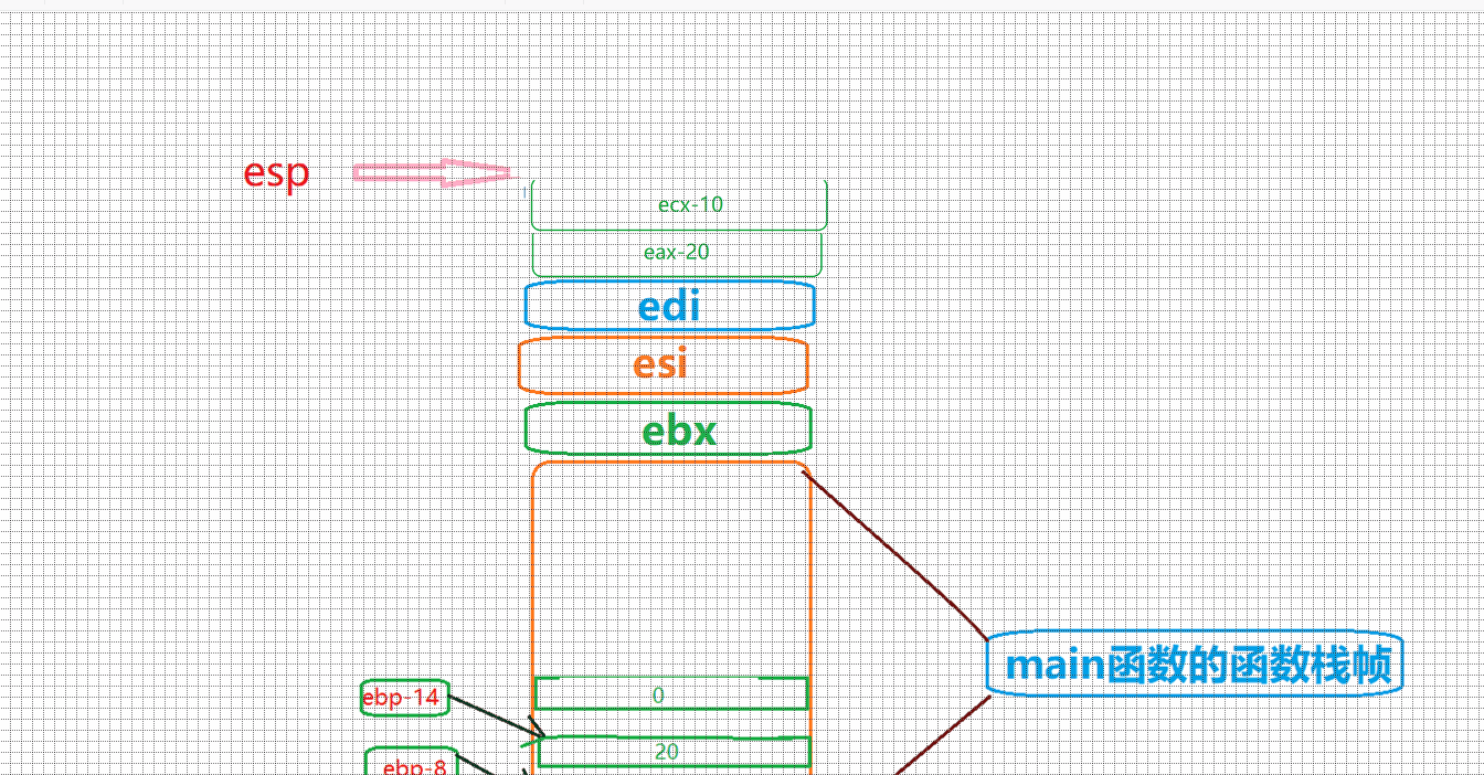 mov dword ptr [ebp-20h],eax 经过这两次压栈后,esp指针指向的地址减小8个字节(一次减小4个字节,也就是1个整型)