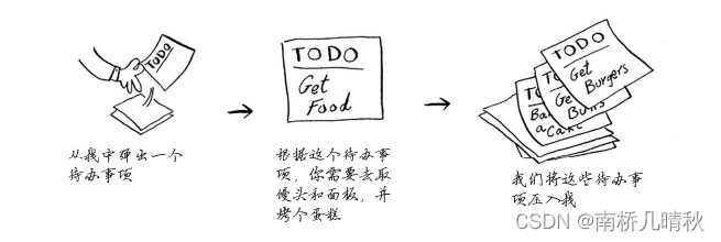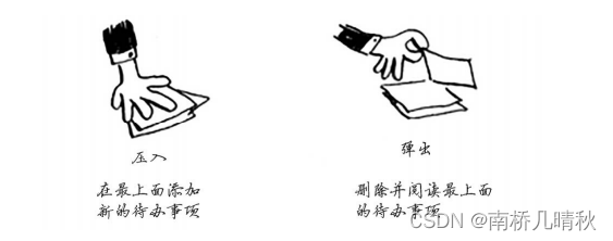 一叠便条要简单得多:插入的待办事项放在清单的最前面;读取待办事项时,你只读取最上面的那个,并将其删除。因此这个待办事项清单只有两种操作:压入(插入)和弹出(删除并读取)。
