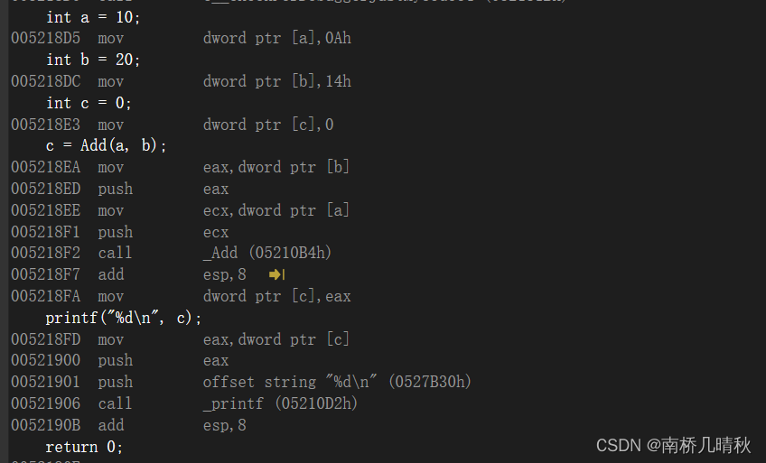 为什么要将call指令的下一条指令的地址存起来呢?? 是因为在Add函数调用结束的时候,需要返回继续执行call指令的下一条指令,所以在执行call指令的时候要将call下一条指令的地址存起来,在Add函数调用结束的时候,就能根据存的地址找到call指令的下一条指令,从而让程序可以继续执行。