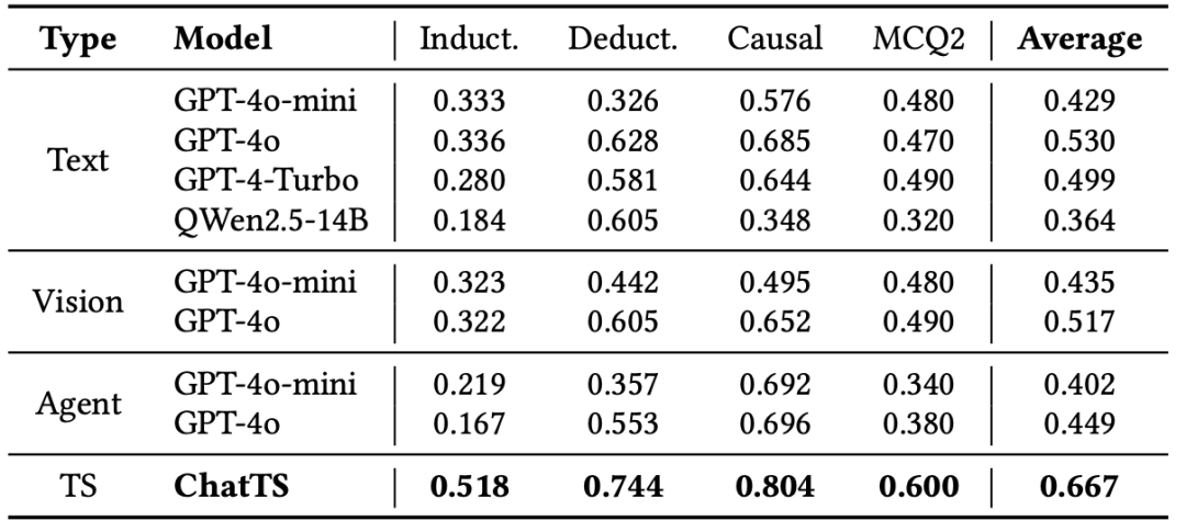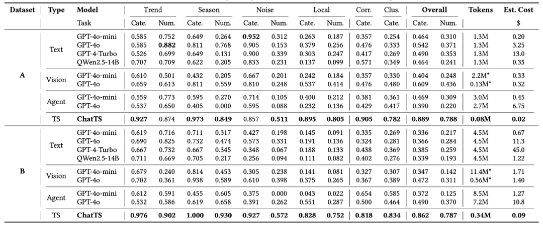 我们将 ChatTS 模型与基于 Text、Vision 和 Agent 的模型进行对比。结果显示,ChatTS 在所有指标上均大幅超越 GPT-4o 及其他基线方法,分类任务 F1 提升 46%–75%,数值任务相对准确率提升超过 80%。