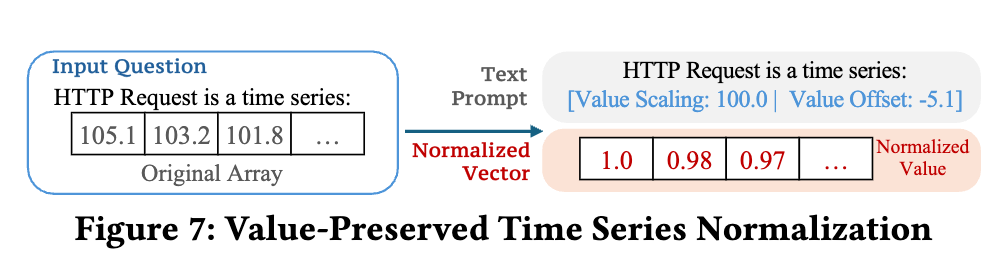 与之配套,我们设计了「数值保值归一化机制」。考虑到原始数值在实际业务中非常重要(如最大 CPU 使用率),我们在对序列进行 0-1 归一化时,同时将归一化参数以文本形式保留进 prompt,使模型既能学习序列形态,又不丢失绝对数值的意义。