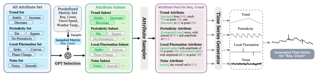 我们定义了一套详细的时间序列属性体系,这些属性具有明确的语义与参数,构成了「属性池」。每个时间序列由若干属性组合生成,并对应一段高质量自然语言描述。这种组合方式不仅确保了生成时间序列的多样性与真实性,还能精确对应语言文本的细节表达,避免了传统「图文描述不符」的问题。