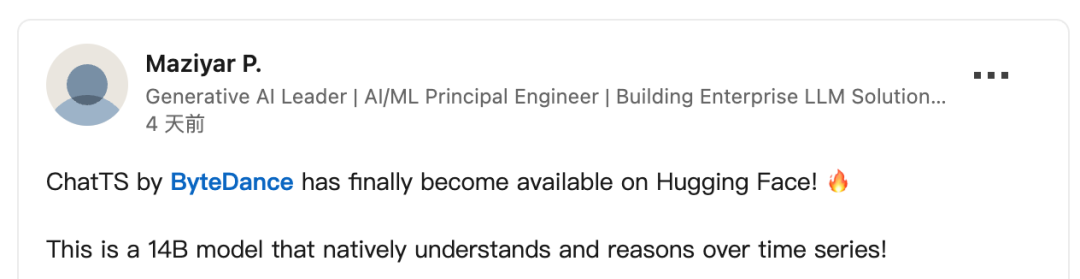 为此,我们提出了 ChatTS,一种原生支持多变量时序问答与推理的多模态 LLM。ChatTS 引来了 HuggingFace 产品负责人 Victor Mustar,以及 SparkNLP 项目负责人 Maziyar Panahi 等人的转发和点赞: