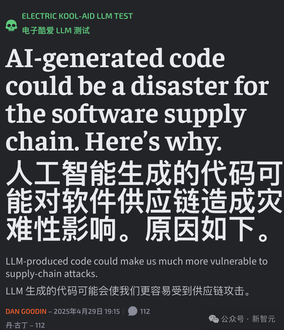 拥有超过25年经验的记者Dan Goodin,则报道了AI生成代码,不仅不能取代人类开发者,甚至可能对软件供应链造成灾难性影响。