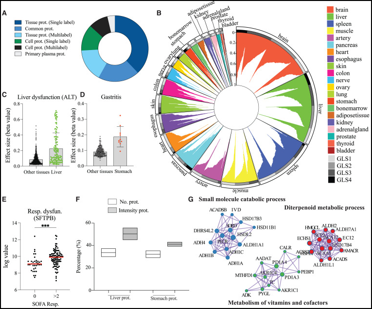 ◉ 图5. 血浆中组织富集蛋白的概况(A)圆环饼图显示了血浆中所有已鉴定的蛋白质及其根据全球分布图谱分配到的全球蛋白质组的百分比分布。◉ (B)一个圆形条形图描述了血浆中识别出的组织富集蛋白,根据其基础组织分配和GLS进行细分。每个条形代表一种蛋白质,颜色表示其在相应组织中的标准化平均丰度水平。目标器官中的标准化丰度根据图例着色。◉ (C和D)点图展示了与肝功能障碍(C)和胃炎(D)相关的组织富集蛋白及其蛋白质关联(效应大小)。误差线表示标准差。这些蛋白质根据全球分布图谱中推断的来源进行分类。◉ (E)点图显示了脓毒症患者中肺表面活性蛋白B的血浆水平,其中呼吸功能障碍(SOFA呼吸评分>2)相对于没有呼吸功能障碍的脓毒症患者(SOFA呼吸评分为0)。◉ (F)我们首先选择了在血浆中检测到的肝脏和胃部富集的所有蛋白质。条形图描绘了两种图谱(HATLAS和EMBL)中蛋白质比例与其在相应器官中的强度比例之间的比较。◉ (G)在(C)中标记为"肝脏"的蛋白质的富集String网络图。每个点代表一种蛋白质,边表示从String得出的蛋白质关联。对指示的比较进行了Mann-Whitney检验。p < 0.05;p < 0.01; p < 0.001。