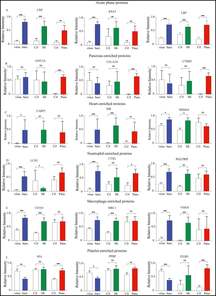 Para_01 第二个队列由因胸痛入急诊科的患者组成,包括有和没有心肌梗死的患者。 心肌梗死组的肌钙蛋白T水平较基线升高(图4B)。 在这个队列中,全球分布图谱能够识别血浆中的24种心脏富集蛋白,并且这些蛋白在不同组织的所有图谱中的平均丰度模式如图4H所示。 与对照组相比,心肌梗死患者的血浆中有五种心脏富集蛋白显著升高,包括肌红蛋白(MB)、脂肪酸结合蛋白、心脏型(FAB3P)和含有三部分基序的蛋白54(TRIM54)(图4I)。 有趣的是,MB、FAB3P和TRIM54已经被提议作为心脏生物标志物。 Para_02 在最终的患者队列中,我们纳入了由不同微生物病原体引起的感染患者(n = 47例病毒性感染,n = 40例细菌性感染)。 先天免疫系统构成了抵御感染的第一道防线。 中性粒细胞、巨噬细胞和血小板是先天免疫系统中的关键细胞参与者,并且对于协调早期宿主对入侵病原体的反应至关重要。 为了靶向和监测细胞衍生蛋白,我们使用基于细胞的图谱来识别特异性富集于中性粒细胞、巨噬细胞和血小板中的蛋白质组。 图4J显示了一部分中性粒细胞蛋白在不同细胞类型中的平均丰度水平。 这些蛋白质,包括抵抗素(RETN)、组织蛋白酶G(CTSG)和脂质运载蛋白2(LCN2),在细菌感染期间的血浆中相对于病毒感染显示出显著更高的丰度(图4K)。 类似的模式也见于巨噬细胞衍生的蛋白质(图4L),其中约有20种巨噬细胞富集的蛋白质在细菌感染患者的血浆中显著升高(见图4M中的例子)。 相比之下,血小板衍生的蛋白质(图4N)与中性粒细胞和巨噬细胞相比表现出不同的血浆蛋白质组丰度谱型。 例如,前血小板碱性蛋白(PPBP)、血小板因子4(PF4)和糖蛋白IX血小板(GP9)在细菌感染中相对于病毒感染主要表现为下调(图4O)。 这很可能是由于血小板减少症,这种症状常见于严重的细菌感染如败血症中。 Para_03 最后,为了测试组织富集蛋白特征的变化是否与特定的病理生理机制或特定条件相关,我们比较了三个患者队列中的组织和细胞富集蛋白变化(图 S5A-S5F:条形图描绘了在三个患者队列中鉴定出的血浆中各种组织富集蛋白的平均丰度模式,与图 4 相关)。 在所有疾病状态下,急性期蛋白的数量统计上显著高于各自的对照组。 这些结果是可以预见的,因为之前已有描述表明急性期蛋白在急性冠状动脉综合征期间会被动员起来,并且败血症和胰腺炎的病理生理学与全身性炎症有关。 相比之下,血浆中胰腺富集蛋白的增加与胰腺炎特异性相关。 此外,心脏富集蛋白的水平在患有心肌梗死和细菌感染的患者中显著升高,与其他队列相比更为明显。 败血症与心脏功能障碍有关,但其潜在的病理生理机制与急性冠状动脉综合征不同,这可能解释了这些观察结果。 此外,中性粒细胞富集蛋白在细菌感染中增加更多,尽管在心肌梗死和胰腺炎患者中也观察到了部分重叠。 因此,结果显示所有患者队列中组织富集蛋白丰度水平既存在共同的变化,也存在独特的变化。 图片说明