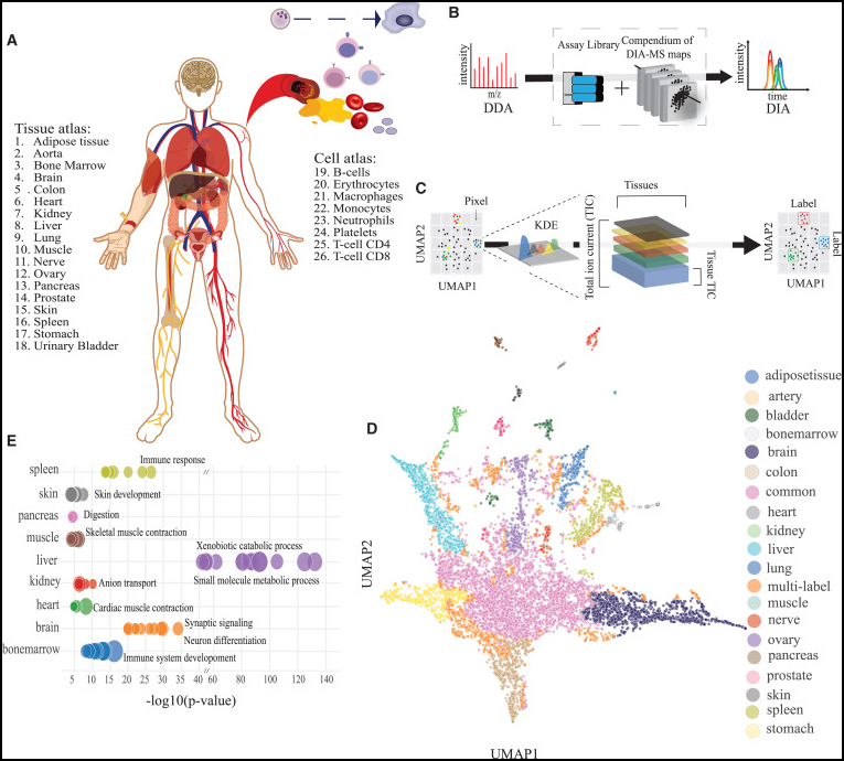 ◉ 图1. 样本和实验策略的概述 (A) 预测对血浆蛋白质组有很大影响的器官和细胞从每个器官和细胞类型至少三个个体中收集或分离。◉ (B) MS实验设计的示意图概览。组织和细胞被均质化并通过SDS-PAGE进行分馏,然后以DDA模式进行LC-MS/MS分析以构建光谱测定文库。◉ 未分馏的组织和细胞样本使用DIA-MS重新分析,生成了156个蛋白质组图谱,并利用光谱文库提取蛋白质的身份和数量(称为HATLAS)。◉ (C) 组织或细胞标签分配策略的示意图概览。◉ (D和E) HATLAS蛋白质组图谱中所有已识别蛋白质的结果UMAP图,突出显示了蛋白质-组织关联。◉ 颜色表示不同的标签分配(单一标签、多标签或常见)。对所有组织分配的蛋白质进行了功能富集分析,并显示了一部分组织的结果(E)。◉ 颜色代表不同的组织,符号大小表示观察到的成功次数,例如该注释簇中的蛋白质数量。另见图S2。