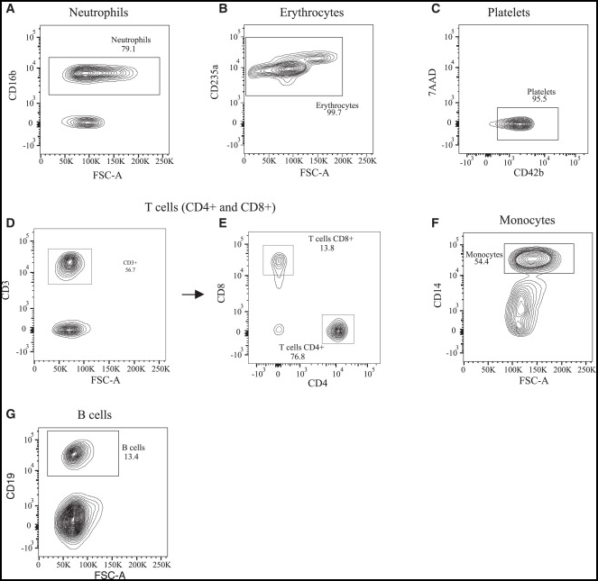 ◉ 图 S1. 流式细胞术分析和细胞分选策略概述,与STAR方法相关(A-G)显示分离的血细胞的流式细胞术分析和细胞分选策略的图像。◉ 这些图像展示了分离的血细胞的流式细胞术分析和细胞分选策略。