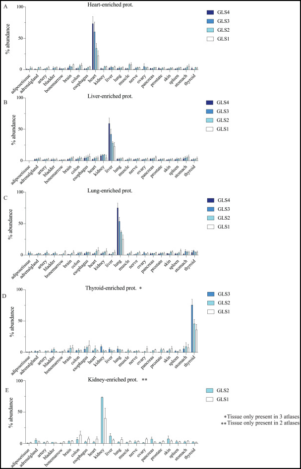 ◉ 图 S3. 每个GLS水平的心脏富集蛋白的定量分布,与图2相关。每个GLS水平的(A)心脏、(B)肝脏、(C)肺、(D)甲状腺和(E)肾脏富集蛋白的归一化蛋白质强度分布。条形图表示每个图谱中的平均丰度,颜色表示GLS水平,误差线表示标准误。◉ 条形图代表每个图谱中的平均丰度,颜色指示GLS水平,误差线表示标准误。