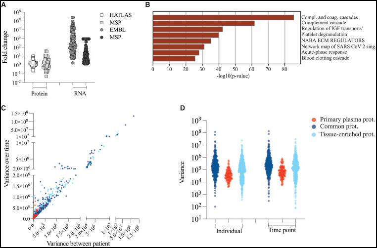 ◉ 图3. 一种基于肝脏中RNA和蛋白质水平之间丰度的数据驱动策略来定义主要血浆蛋白(A)该点图显示了在RNA图谱中与蛋白质图谱相比,肝脏丰度比至少高5倍的126种蛋白质。◉ (B)水平条形图显示了定义的主要血浆蛋白的功能富集分析。◉ (C和D)(C)散点图和(D)小提琴图显示了所有个体和不同时间点的所有定量组织富集蛋白、常见组织蛋白和主要血浆蛋白的计算方差。◉ 红色圆点表示主要血浆蛋白。◉ 浅色圆点表示组织富集蛋白,深蓝色表示定义为常见的蛋白。