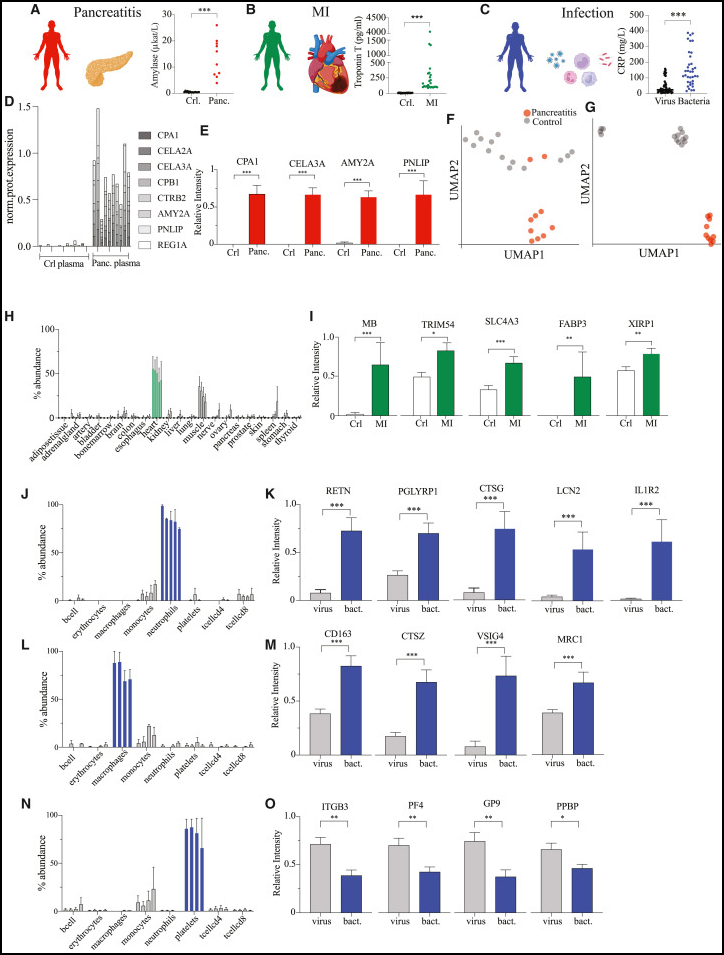 ◉ 图4. 血浆中组织或细胞蛋白特征的病理变化(A-C)在急诊科入组的胰腺炎、心肌梗死和感染队列及其相关临床生物标志物(淀粉酶、肌钙蛋白T和C反应蛋白)的概述。所有患者的血浆样本均使用DIA-MS分析,通过光谱库提取蛋白质强度,生成了161个DIA-MS蛋白质组图谱。所有蛋白质的来源是通过全球分布图谱推断出来的。◉ (D)堆叠条形图显示了胰腺炎血浆队列(对照组与胰腺炎组)中八个胰腺富集蛋白质的标准化蛋白质丰度。◉ (E)条形图说明了相对于健康对照组,在胰腺炎血浆中显著升高的四种胰腺富集蛋白质的丰度模式。◉ (F和G)使用所有鉴定出的血浆蛋白质或仅使用由全球分布图谱定义的GLS为4的胰腺富集蛋白质过滤后的胰腺炎队列的均匀流形近似和投影(UMAP)。◉ (H)条形图显示了在不同组织中鉴定出的五种心脏富集蛋白质的平均丰度水平。◉ (I)条形图说明了相对于对照血浆,在心肌梗死血浆中显著升高的三种心脏富集蛋白质的丰度模式。◉ (J和K)(J)条形图显示了一部分嗜中性粒细胞富集蛋白质的平均丰度水平,(K)以及这些蛋白质在细菌感染患者血浆中的平均丰度模式与病毒感染相比。◉ (L和M)(L)条形图显示了选定的巨噬细胞衍生蛋白质的标准化平均丰度水平,(M)以及它们在血浆中的丰度模式(病毒感染与细菌感染对比)。◉ (N和O)(N)条形图说明了所有细胞类型中富集蛋白质的标准化平均丰度,(O)以及它们在感染血浆队列中的平均丰度水平(病毒感染相对细菌感染)。◉ 误差线表示标准误,对于指定的比较进行了Mann-Whitney检验。p < 0.05;p < 0.01; p < 0.001。另见图S4和S5。