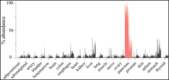◉ 图 S4. 胰腺炎血浆队列中鉴定的胰腺富集蛋白,与图 4 相关。一个条形图说明了不同组织中蛋白质平均丰度。这些蛋白质被分类为胰腺富集蛋白(GLS > 1)并在胰腺炎血浆队列中鉴定。◉ 每个条形代表一种蛋白质及其平均丰度,误差线表示平均值的标准误差(SEM)。