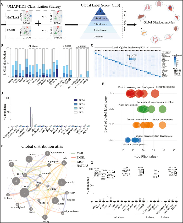 ◉ 图2. 人类蛋白质组的全球分布图谱(A)在UMAP投影上使用KDE为每个图谱(称为HATLAS、EMBL、MSP和MSR)分配组织-蛋白质/RNA标签。每个分析物根据相应图谱中的组织或细胞分配获得加权标签分数。每个蛋白质的标签分数相加得到一个全局标签分数(GLS),具有最高GLS的组织或细胞被用作主要注释。◉ (B)显示每种组织GLS水平的条形图。◉ (C)热图展示了在每种GLS水平下组织富集蛋白质的平均丰度。◉ (D)脑富集蛋白质在每种GLS水平下的归一化蛋白质强度分布。柱状图代表各图谱中平均丰度,误差线表示标准误。◉ (E)不同GLS水平下脑富集蛋白质的功能富集分析。颜色代表不同的GLS水平,节点大小表示富集途径中识别出的蛋白质数量。◉ (F)基于全球分布图谱的蛋白质-组织分配综合网络。节点表示分配的组织富集蛋白质,其大小反映了每个组织中的蛋白质数量。边和不同颜色代表从各个图谱中指定的多标签蛋白质,并按颜色编码。◉ (G)在全球分布蛋白质组图谱中具有高GLS和组织特异性的蛋白质示例。另见图S3。