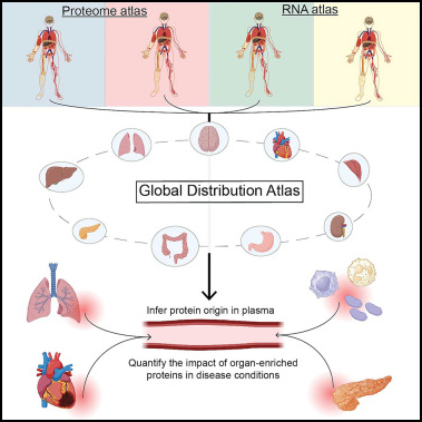 Basic Information 英文标题:Human proteome distribution atlas for tissue-specific plasma proteome dynamics 中文标题:人类蛋白质组分布图谱用于组织特异性血浆蛋白质组动态研究 发表日期:15 May 2025 文章类型:Resource 所属期刊:Cell 文章作者:Erik Malmström | Johan Malmström 文章链接:https://www.sciencedirect.com/science/article/pii/S0092867425002867 Highlights Para_01 构建了来自21种组织和8种细胞类型的蛋白质和RNA分布图谱 开发了一种全球标签评分,以客观确定蛋白质与组织的关联 该资源可以推断血液血浆蛋白质组的组织来源 能够在疾病期间增强对器官富集蛋白面板的定量分析 Summary Para_01 血浆蛋白质组由周围器官和细胞的蛋白质流入和流出维持。 为了量化不同器官和细胞在健康和疾病状态下对血浆蛋白质组的影响程度,我们开发了一种基于质谱的蛋白质组学策略,以推断在人类血浆中检测到的蛋白质的组织来源。 我们首先构建了一个来自18个血管化器官和血液中最丰富的8种细胞类型的广泛的人类蛋白质组图谱。 该图谱与之前的RNA和蛋白质图谱相结合,客观定义了全蛋白质组的蛋白质-器官关联,以推断其来源并实现血浆中器官特异性蛋白质的可重复定量。 我们证明了该资源可以确定六种独立患者队列(包括败血症、胰腺炎和心肌损伤)中的疾病特异性定量变化的器官富集蛋白质组。 该策略可以扩展到其他疾病,以推进我们对导致血浆蛋白质组动态变化的过程的理解。 Graphical abstract Keywords plasma proteome; mass spectrometry; tissue damage; organ dysfunction; biomarkers; tissue origin; tissue protein; plasma proteome dynamics; human proteome atlas Introduction Para_01 对人类蛋白质组的持续编目揭示了组织会产生由组织富集蛋白和在许多不同细胞和组织中普遍产生的蛋白质组成的组织特异性蛋白质库。 这些蛋白质库协调了不同器官和器官系统中执行的组织特异性和基本细胞功能。 与组织和细胞不同,血浆中没有蛋白质合成。 相反,血浆蛋白质组的组成是由周围细胞和器官的蛋白质流入和流出维持的。 Para_02 根据起源和功能,先前的报告表明,血浆蛋白质组中的蛋白质可以大致分为两类。一类是由肝脏产生的大量血浆蛋白,它们参与了血浆的主要功能,如提供胶体渗透压并通过补体和凝血系统维持止血。例如人血清白蛋白、载脂蛋白、急性期蛋白以及补体和凝血系统的蛋白质。 另一类数量更多但通常含量较少的是不参与血液血浆主要功能的组织蛋白。这些蛋白质来自周围的细胞和器官,作为正常周转的一部分。疾病或损伤可能会导致细胞或组织受损,导致组织蛋白泄漏到体液(如血浆)中,这些蛋白可以用作疾病诊断和预后的生物标志物。 显著的例子是心肌肌钙蛋白和胰腺α-淀粉酶,其中血浆浓度的增加分别用于诊断急性心肌梗死和胰腺炎。 此外,在动物模型中的研究表明,富含组织的蛋白质在疾病期间会发生丰度变化,并可用于评估器官功能障碍。 目前,关于人类受试者在健康和疾病状态下细胞和组织蛋白渗入血浆的性质和动态的系统性研究仍然缺失。 Para_03 在此,我们创建了一个覆盖主要人体组织和血液细胞的人类蛋白质组分布图谱。 我们将基于质谱的蛋白质组分布图谱与之前发表的三种人类蛋白质或RNA图谱合并,生成了涵盖29种不同人体组织和血液细胞的蛋白质和转录本丰度的综合基线图谱。 利用这一图谱,我们证明了周围组织对血浆蛋白质组有特定贡献,并且在疾病(如心肌损伤、胰腺炎和败血症)等病理事件中,组织富集蛋白的组成会发生变化。 Results Construction of a blood-plasma-centered tissue and cell distribution atlas 构建以血浆为中心的组织和细胞分布图谱