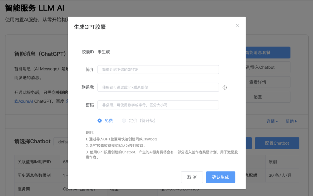 生成时需要填写的主要内容为GPT简介,以及一个GPT开发者的lanying.link地址,方便使用者联系作者,再加上密码和定价: