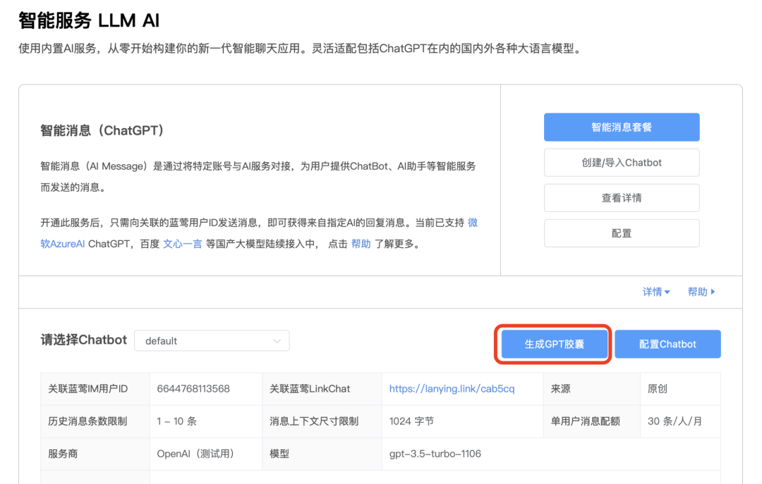 如前所述,你只需要在创建Chatbot之后,使用生成GPT胶囊即可创建自己的GPT应用。
