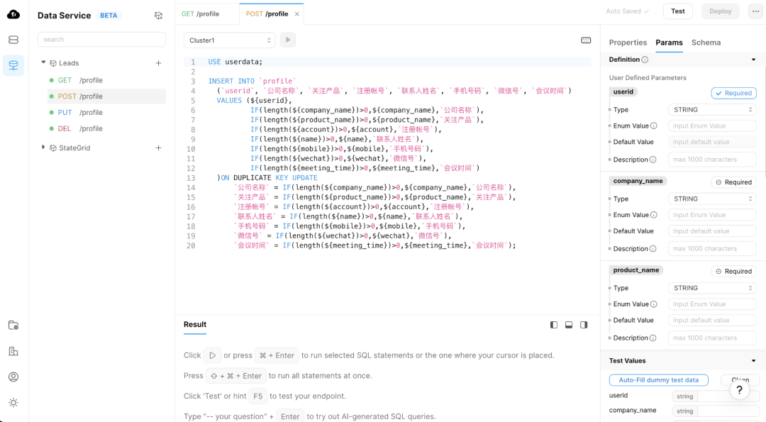 在TiDB Data Service中,会自动映射一个RESTful API,如下: