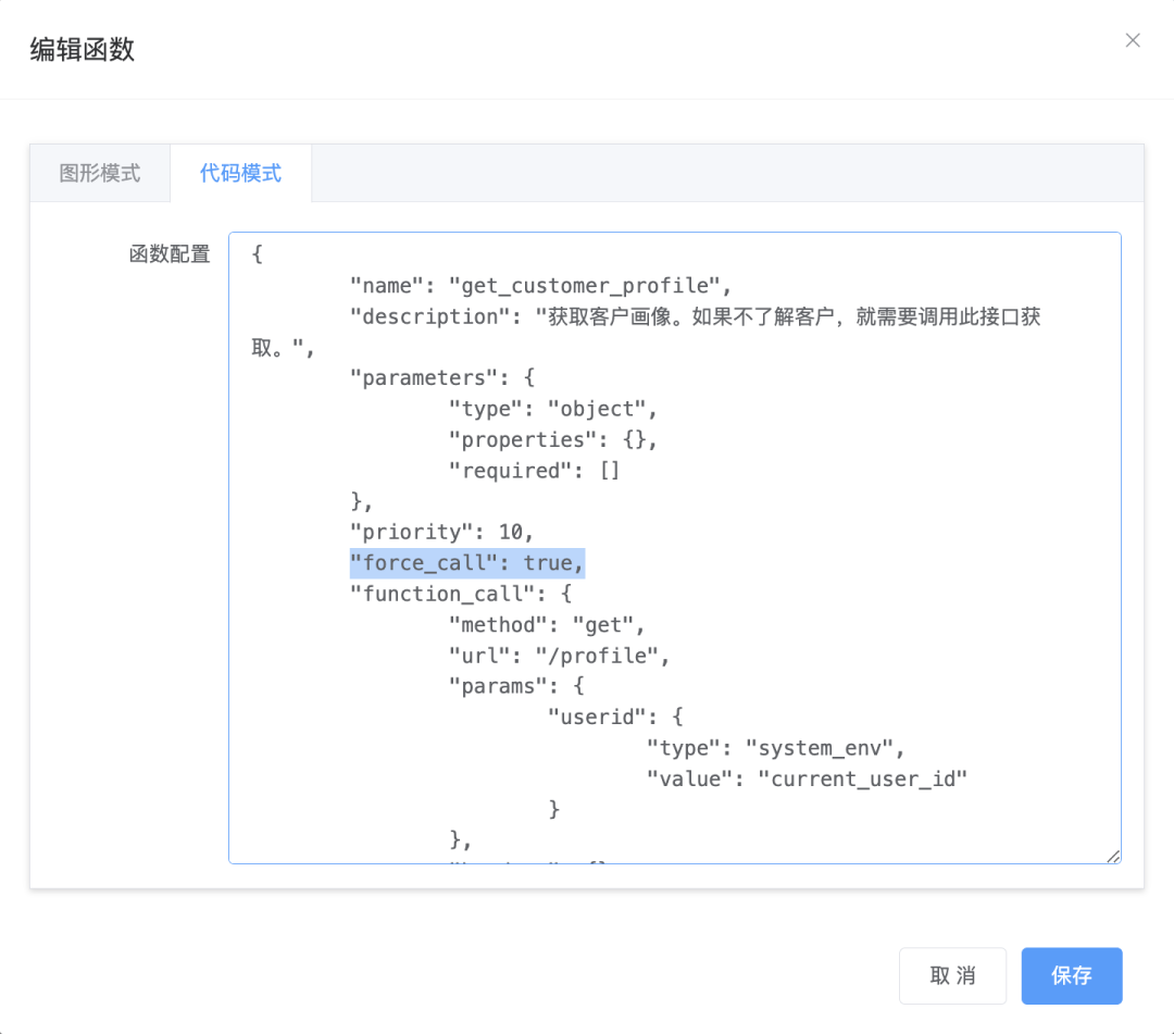 因此,我们在函数中增加了强制调用的配置 "force_call": true。设置了这个参数,那么在调用AI之前,Agent框架就会先行调用对应的API,并将其结果传给AI进行处理。