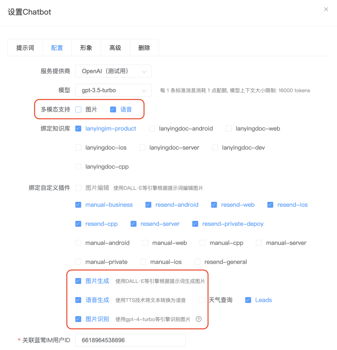 依然是在智能消息服务里找到配置Chatbot,勾选多模态支持,那么向AI发送的图片就会被AI进行识别,具体如何识别,则依赖系统插件中的图片识别插件: