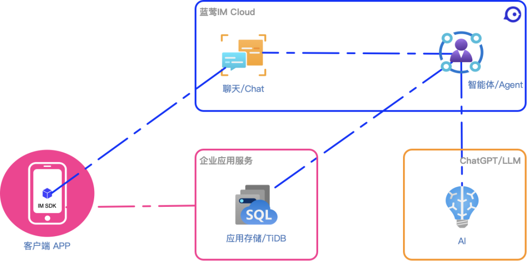 企业可以通过集成蓝莺IMSDK,同时拥有Chat和AI两大功能,当前AI引擎已支持ChatGPT(包括OpenAI和Microsoft Azure)、Anthropic Claude、Minimax、百度文心一言、智谱AI,讯飞星火、阿里通义千问陆续接入中。