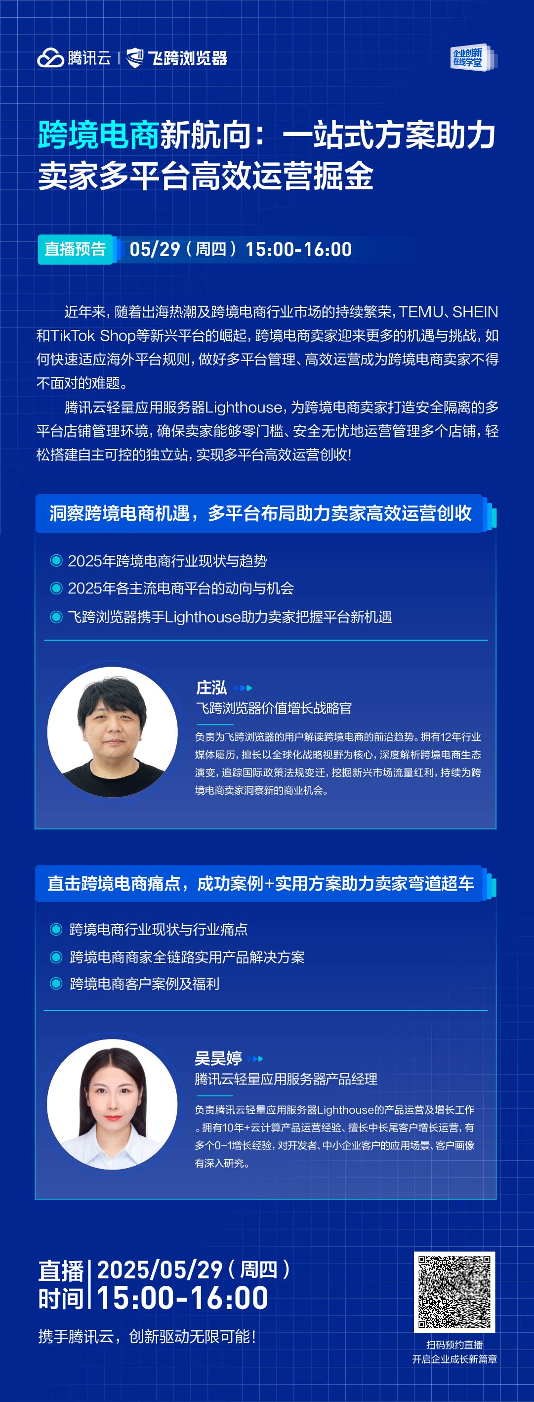 👇 扫码报名观看直播,腾讯云及飞跨浏览器专家将分享最新行业趋势洞察、直击行业痛点,手把手带您轻松搭建自主可控的独立站,实现多平台高效运营创收!