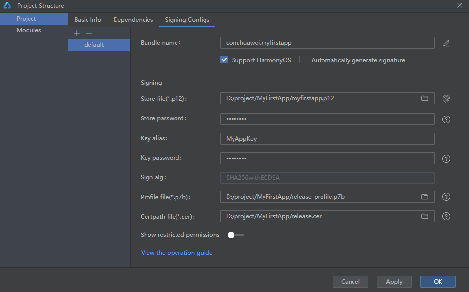 packageHash的值用于验证hap包的完整性。MAC上需要通过shasum工具生成:shasum -a 256 [path-to-hap];Windows系统下可通过certutil -hashfile [path-to-hap] SHA256命令获取。sign的值用于校验描述文件签名。需要使用internal-testing工具获取,该工具提供了.bat文件可以直接在Windows系统设备的终端中运行:manifest-sign.bat -operation sign -mode localjks -inputFile D:\old.json5 -outputFile D:\new.json5 -keystore D:\enterprise.p12 -keystorepasswd 123456 -keyaliaspasswd 123456 -privatekey enterprise在Mac系统中,需要在终端运行如下命令: