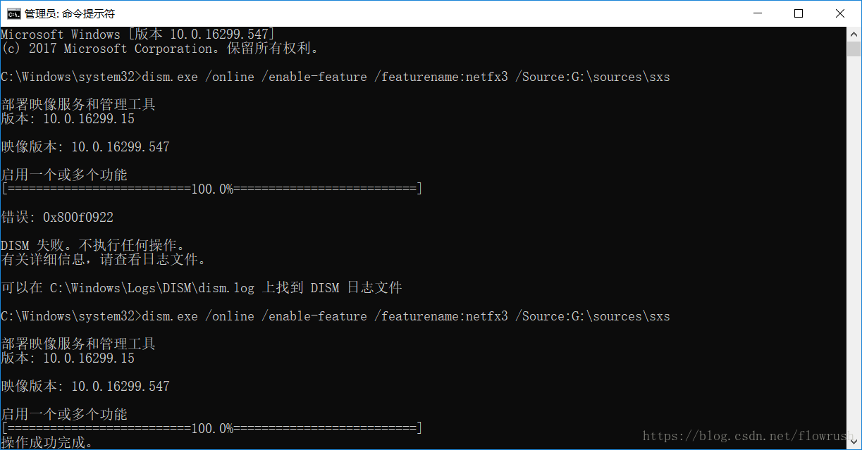 执行命令后,等待部署进度至100%,提示“操作成功完成”,即表示已经完成了Windows10系统的.NET Framework 3.5安装。