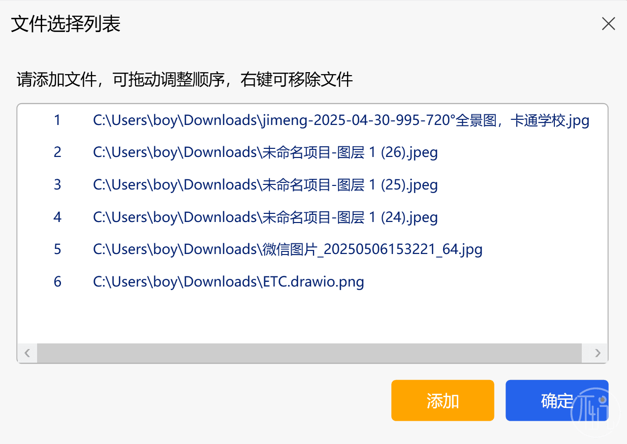 在选择文件时会弹出上面的处理窗口,在这儿添加、调整顺序、删除文件即可。