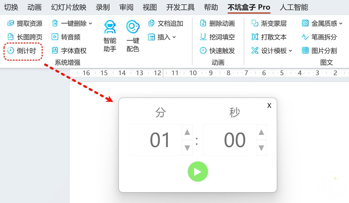 在放映的时候,一旦进入这个页面,倒计时便会开始执行,不能用点击和下一项触发,也不能给它添加动画。