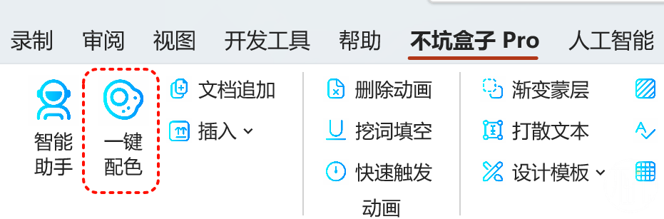 新版的不坑盒子,可以实现在PPT中一键配置主题颜色。