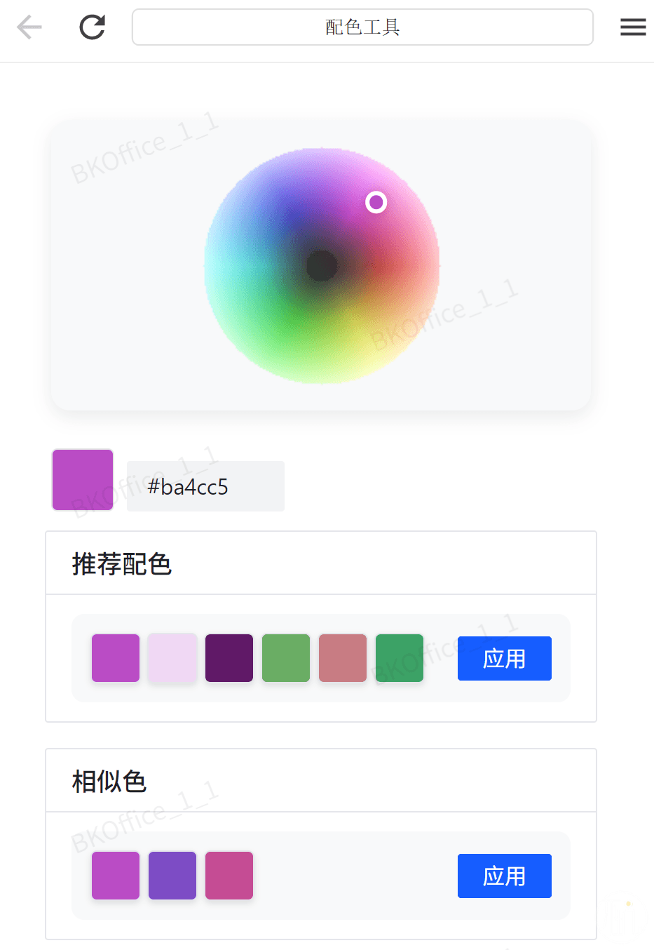 在配色界面,我们在色轮中选择一个喜欢的颜色,它会自动为我们生成相关的颜色,目前支持:推荐配色、相似色、对比色、三角色、方形色、单色系、分裂互补色、双分裂互补色、明暗对比、冷暖对比。