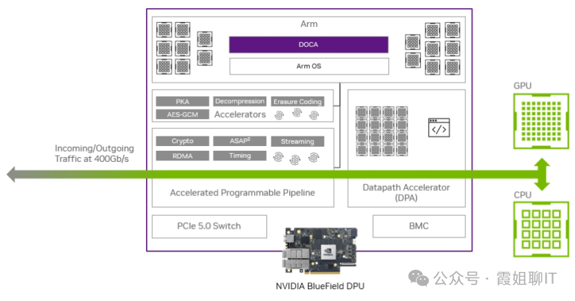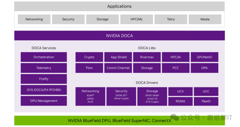 就像NVIDIA的GPU配套CUDA一样,BlueField-3 DPU也有自己配套的软件框架DOCA。