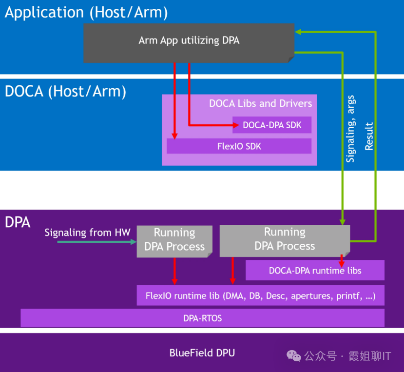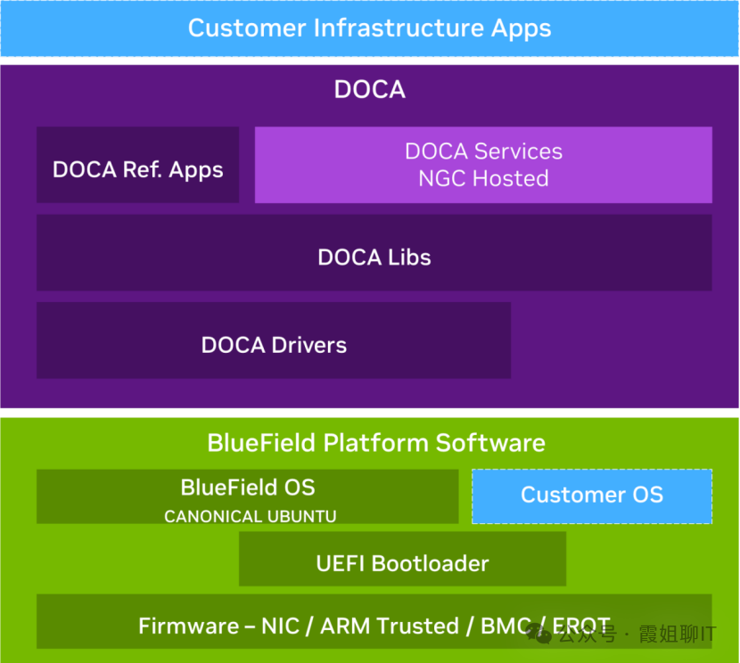2:BlueField 软件包:该软件包位于DPU设备上,包括固件、OS、DOCA运行时驱动程序和库。